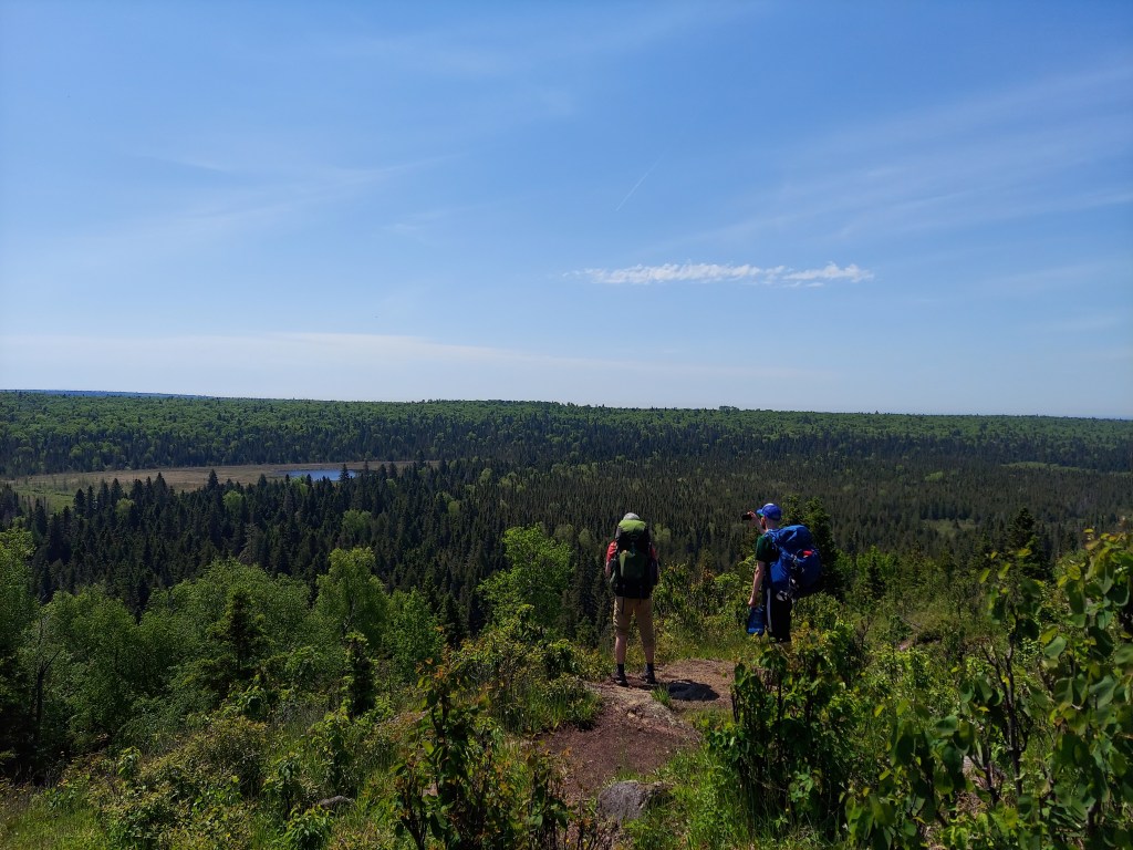 The second day’s hike begins with a placid wrap around Feldtmann Lake’s southern shore, the trail high and dry from the surrounding swampland on a short ridge, moose prints dotting the mud. We then charge up a steep climb to Feldtmann Ridge, which offers looks back over the lake and to Superior beyond, a series of false summits offering better and better views before we settle into a ridgetop plod, often in direct sun. Next comes a beaver pond and a gentle trickle of a stream before we come to a defunct fire tower that now serves as a lunch spot, where we meet an older couple heading the opposite direction and the Chicago area women, one of whom gracefully tips over her camp chair while holding a freshly reconstituted bag of freeze-dried chili. We clamber up the tower as far as we can for equal doses of pretty views and vertigo before continuing on our merry way. The trail descends into the largest birch grove I’ve ever seen, though it later degenerates into a buggy, scrubby, scorching hot swampland as we slog across the final miles to Siskiwit Bay.