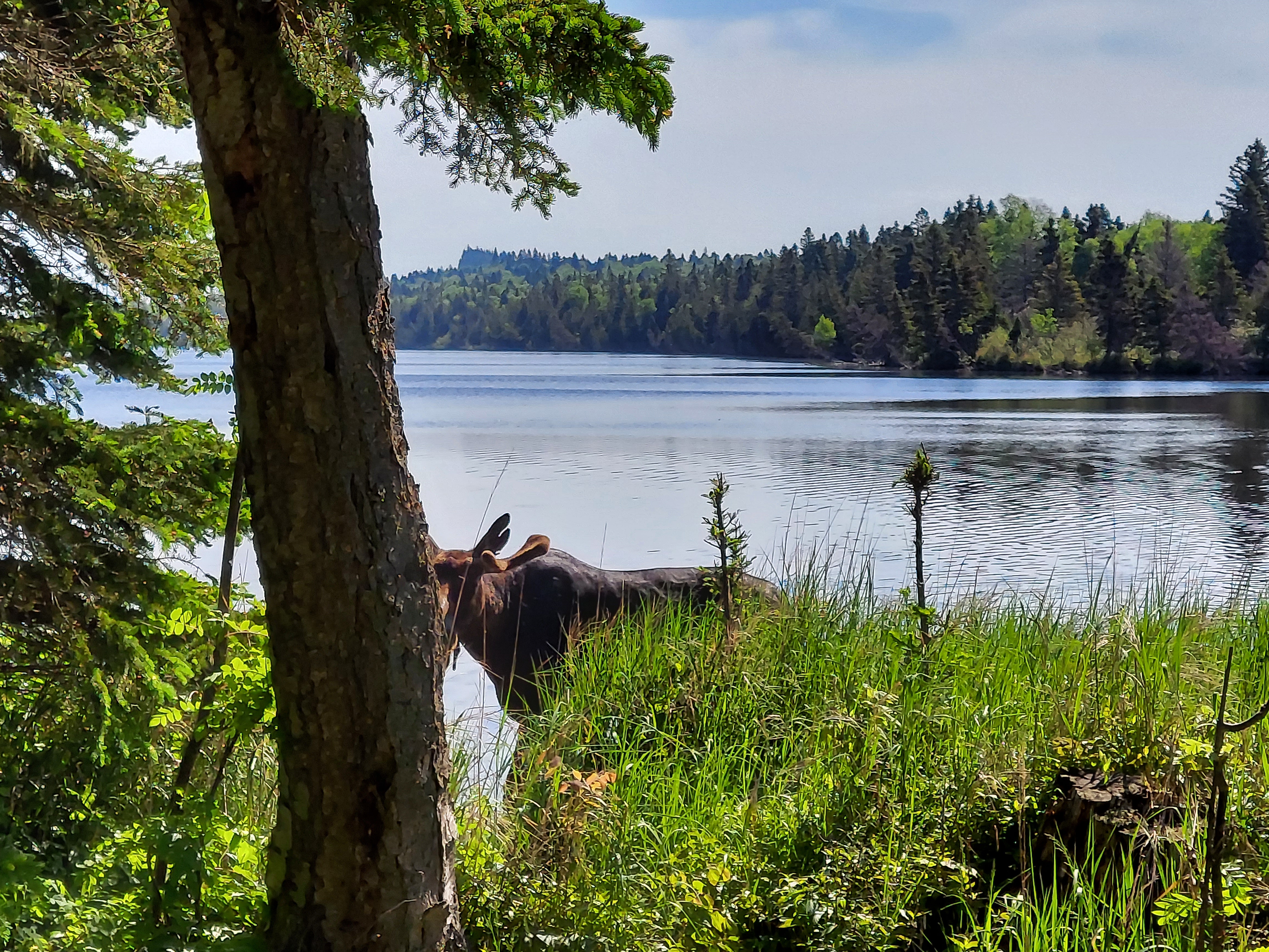 Despite the lack of seating options, a strong breeze off Feldtmann Lake knocks down all the bugs on the first night and gives us a pleasant evening. We take our dinner a short distance away at the placid pebble beach of Rainbow Cove along Lake Superior. Later, back at the site, we deploy a wood-burning stove of questionable legality and stay up late enough to watch the stars come out. A thunderstorm hits while we’re still in tents the next morning, and after it blows over, I peek out of my tent for the first time and am immediately greeted by a female moose plodding past our site down the path. Success! I’m too slow with the camera to get a respectable picture, but I need not worry: a short while later she makes her way back up the shoreline, stopping to chew on plants, and a male friend follows her shortly thereafter. We take our time to admire them from as close a distance as we dare.