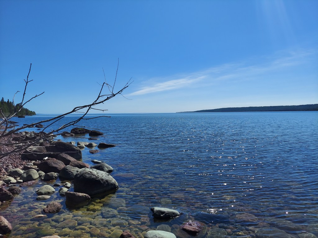Siskiwit Bay is a prominent bite into Isle Royale’s southern shoreline. A large vessel, perhaps from the Coast Guard, sits at anchor toward its mouth, and after sunset, a distant lighthouse blinks away. The two shelters are already taken, but we claim the best of the tent sites, open to the wind and with an access down to a small private beach. We while away the afternoon here and eat dinner in a shadier spot down on the main beach by the large new dock, where the pebbles conveniently rest in a seat-height berm. A picnic table at the end of the dock catches a strong breeze, and we stay out here as the sun plunges into the horizon. Our muscles ache and a rodent may have gotten into the cookies, but none of that matters. We are deep into hiking trip bliss.