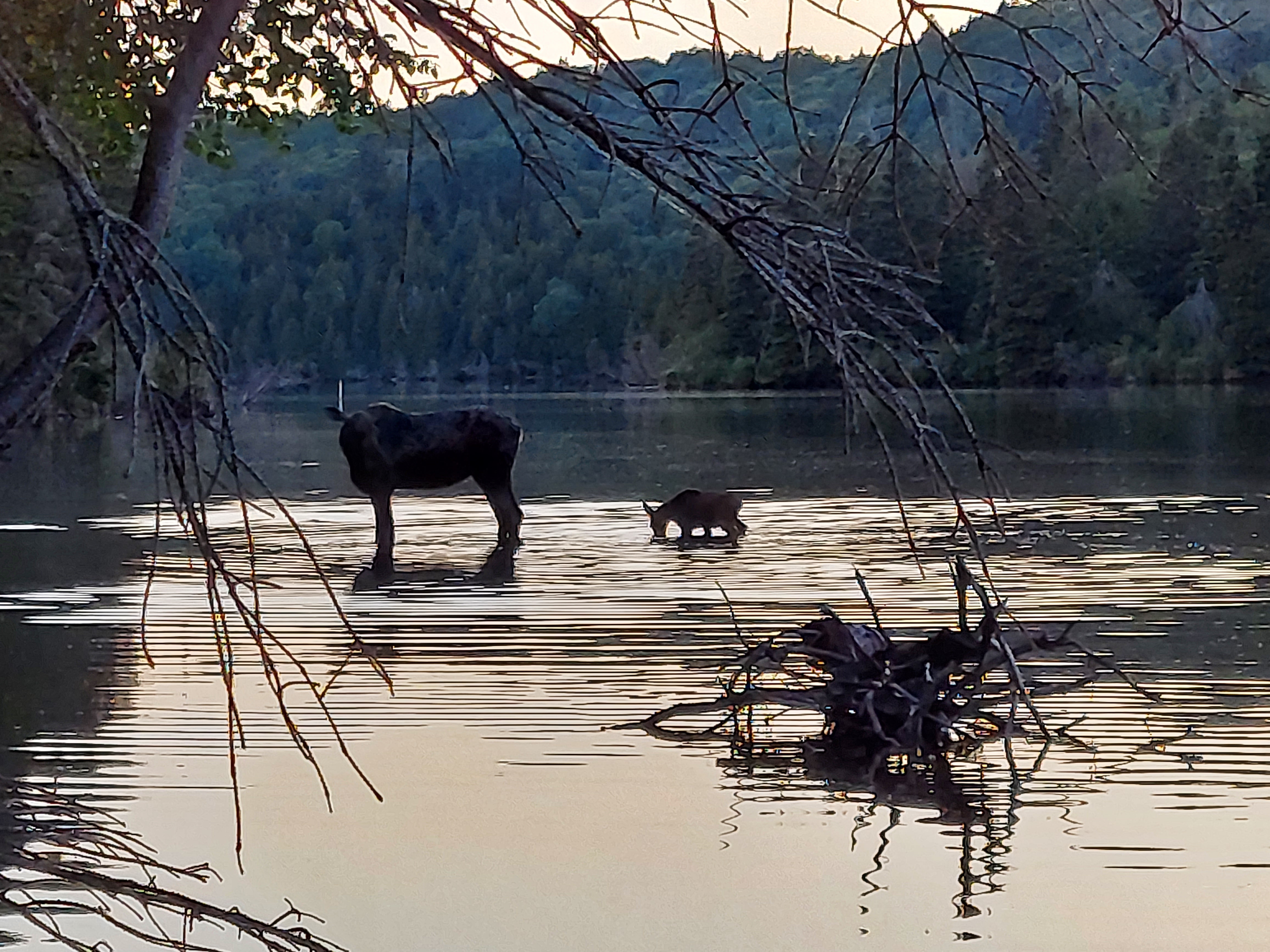 The moose show is only beginning, though. A short while later we pick out a mother and her calf, who cannot be more than two or three weeks old. They pick their way upstream, and, with some urging from its mother, the calf emits some near-human wails as it strikes out across the water to join her. Next, an interlude of amusing ducks and ducklings, which Connor calls the Greek chorus of our trip. Two more moose, including a large bull, wake us early the next morning, and a distant female downstream provides the final act. Mission accomplished.