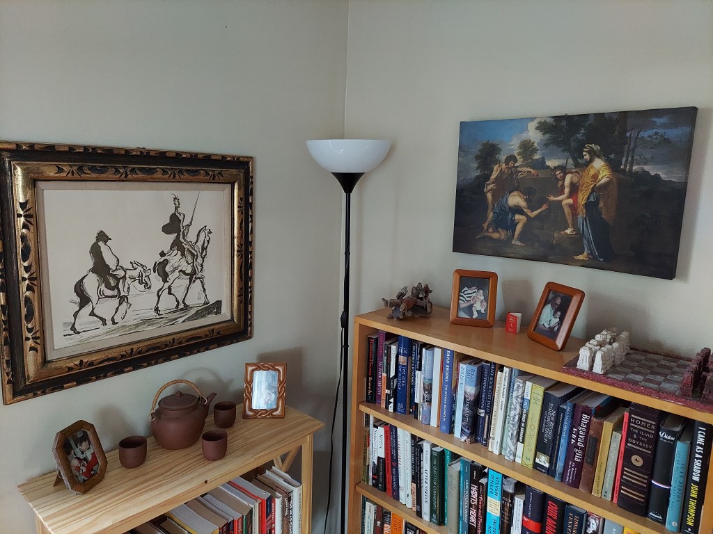 My maternal grandparents sit beneath Don Quixote. This piece came directly from them amid late life downsizing; I remember its old resting place above an entertainment stand in the house on Edgewood in Lombard, Illinois. (The stand was dominated by a radio, a fact that now would seem to suggest it was a relic of the Ming Dynasty.) From that pair of 1940s University of Chicago lovers I needed little in the way symbolism: the dynasty they founded and the lives they lived have stood on their own. But the words in which they immersed us all provide guides, too.