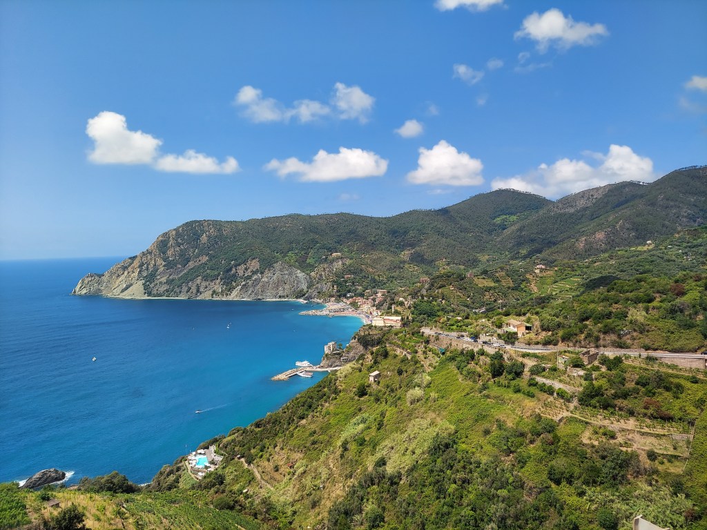 Sicily’s blend of natural and human beauty sets a very high bar, but if anywhere can clear it, a few towns on the northwest coast of Italy may be the place. The bus ride from Livorno north to La Spezzia is an immersion in Tuscan and Ligurian countryside. The monuments in the Piazza dei Miracoli in Pisa rise up out of the morning haze in the distance, and the mountainous mines of Carrara marble loom below ghostly clouds. Hilltop fortress towns from the Middle Ages stand watch over the autostrade, and in the incredibly compact La Spezzia, the tour bus splits into two mini-buses that can handle the winding roads beyond. We are off to Cinque Terre.