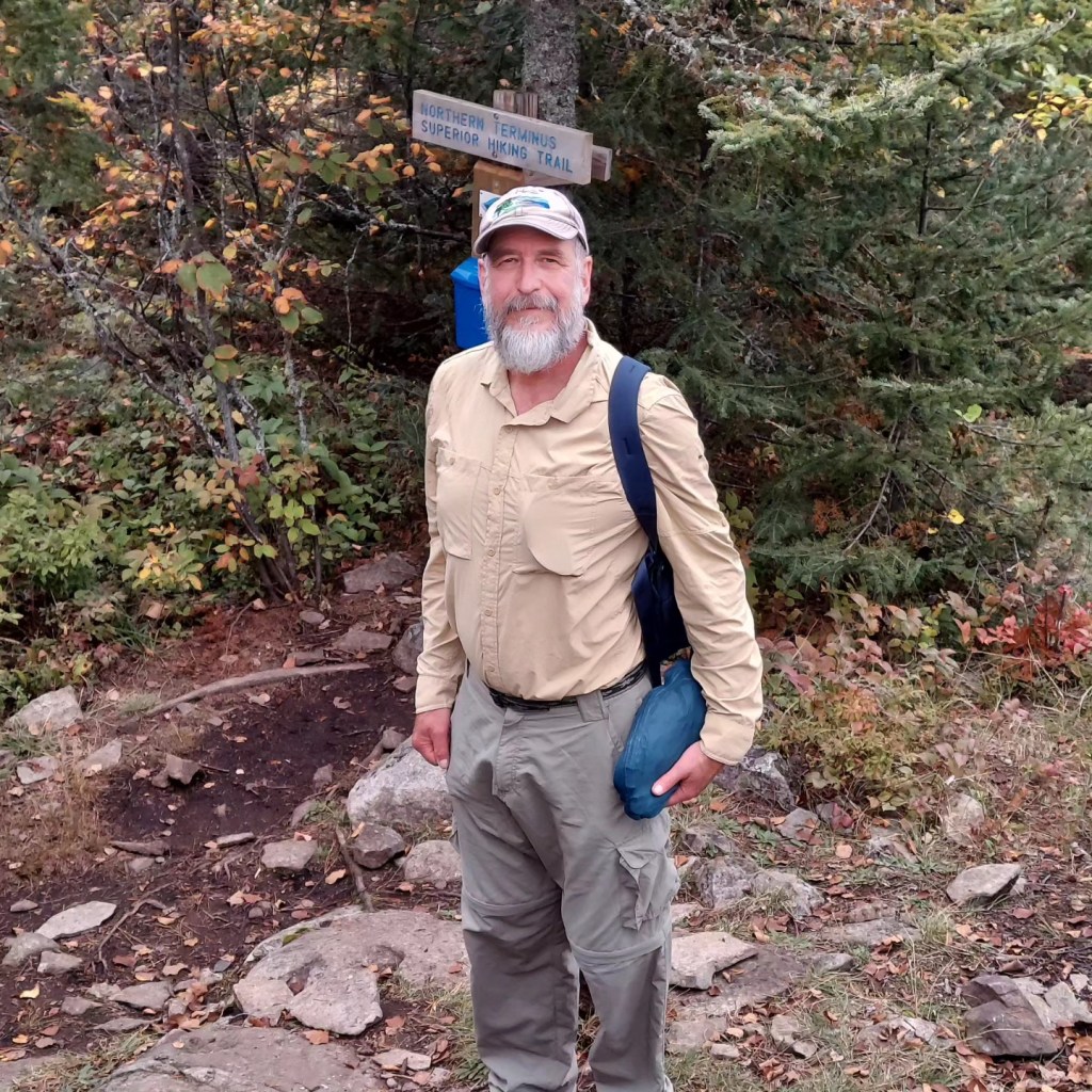 I am here as support. We perform a series of maneuvers, with me backtracking and moving my car to allow my dad to proceed with a lightened load through certain stretches on his steady march south. We plow through the forest between trail’s end and Andy Lake Road, its renaissance under way after logging some fifteen years ago. We push up Rosebush Ridge, host to the highest point on the entire SHT; the view is nondescript, but the maple forest in peak fall form is its own front-line attraction. Further south, the Hellacious Overlook, though much further inland than most SHT vistas, gazes down upon across beaver ponds and golden fall trees toward Lake Superior, and we squint at the lumpy blobs on the horizon, unsure if one of those clouds is Isle Royale. Even inland from its usual lake-lining ridges, the trail offers up its customary beauty.