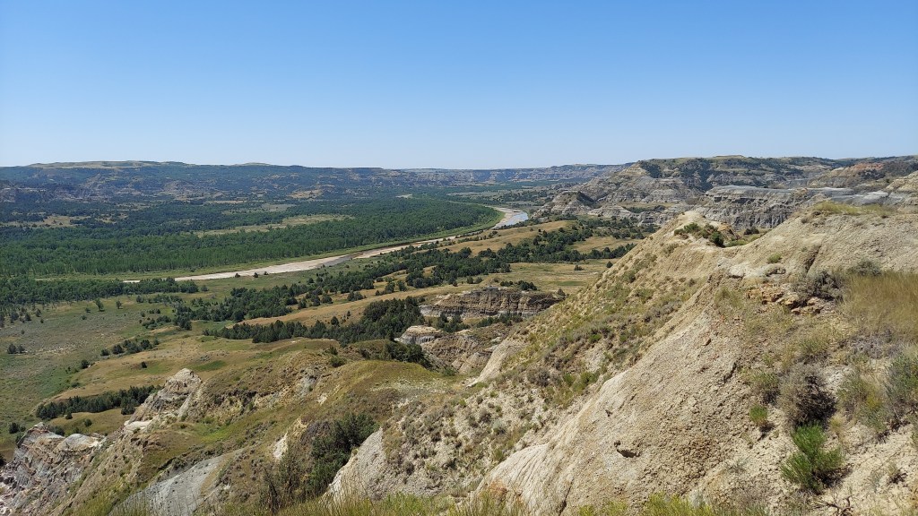 I fly across Minnesota and eastern North Dakota with few stops and spend an unremarkable night in Bismarck. The next morning I pay my respects at Salem Sue, the silent sentinel at the entrance to the West, and take in the first tentative buttes hinting at the hills and mountains to come. After numerous past visits to the South Unit of Theodore Roosevelt National Park, I swing off the freeway in Belfield and head for the North Unit. The basics here are much the same, badlands lining the floodplain of the Little Missouri River, scars and pockmarks interrupting the flatlands and beckoning the visitor in. Bison clump along the road and sometimes in the middle of it, and the campground is maybe half full on a Friday night.