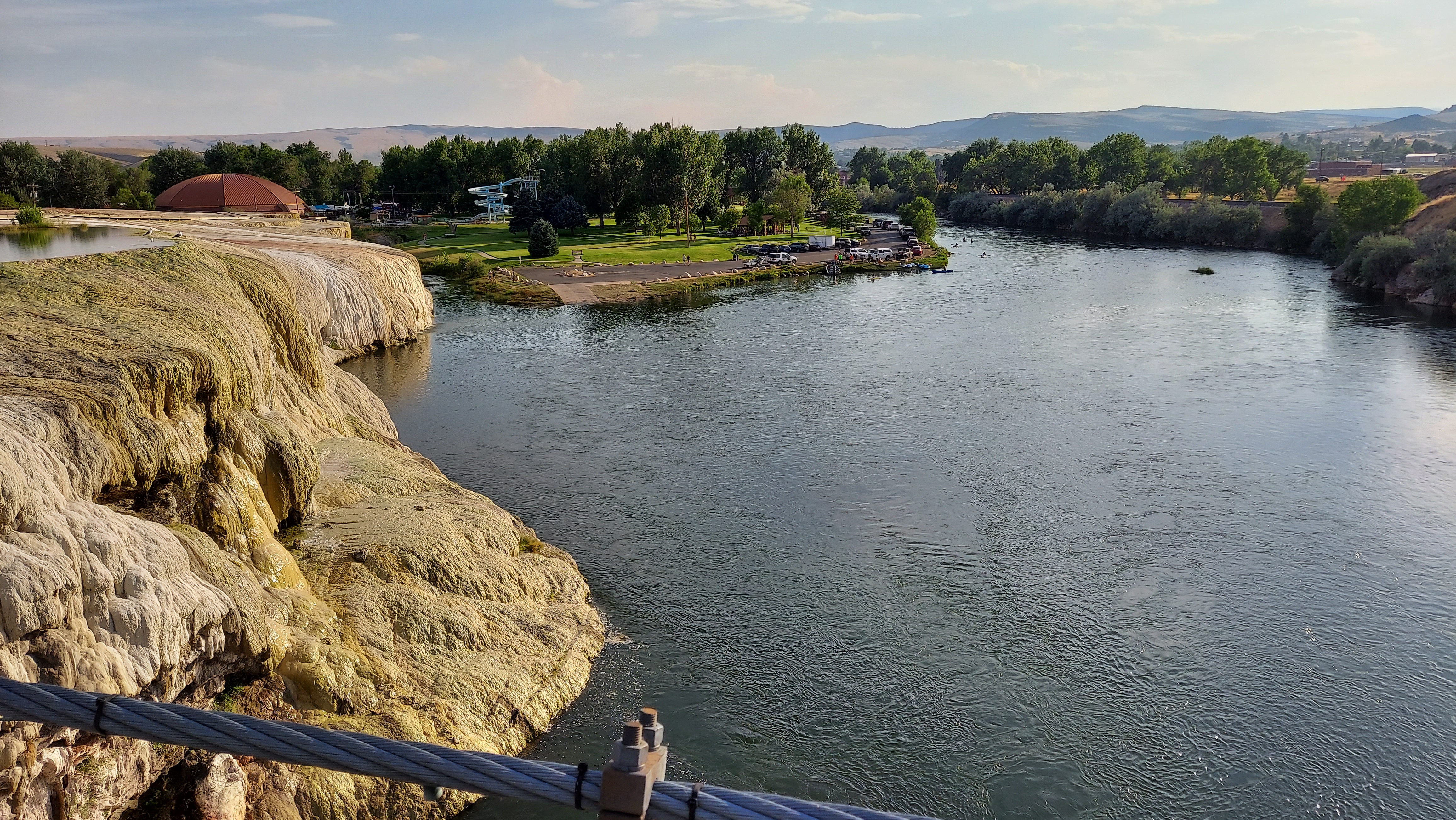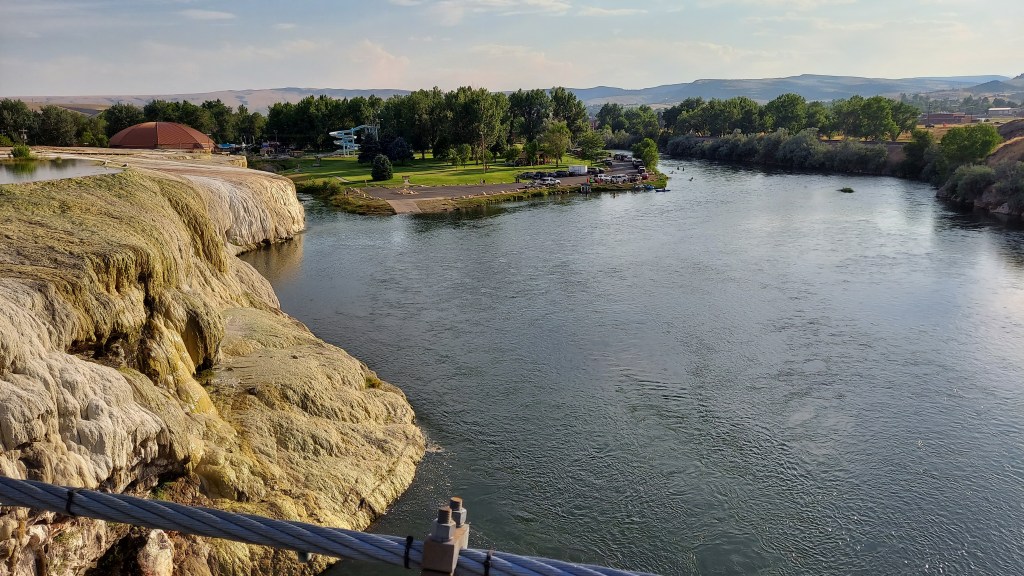 Thermopolis, Wyoming strikes me as a triumph of what the West can be. A town of just 3,000 people, it has the good fortune sit right where the Bighorn River slips out of the Wind River Canyon (the Bighorn and the Wind are, in fact, the same river), and the world’s largest mineral hot spring bubbles up beside it dumps on in. The area around the hot spring is a state park, guaranteed free for use by an age-old US government treaty with the Shoshone and the Arapaho, and I happen to visit during Discovery Days, which has a host of Native families picnicking on the sulfurous grounds around the spring. On this 100-degree day I am not too enthused about a dip in 105-degree water, so I make do with a stroll about to drink in the scene, and am too late to see the town’s top-notch dinosaur museum, too. Downtown Thermopolis has bustling shops and a surprising degree of culinary variety and a respectable brewery, where I post up at the bar and meet a couple completing the woman’s cross-country move to be with her snowboard guide partner in Jackson, and later two fishermen from Cheyenne. The snowboarder wins a few hundred dollars in a dice game jackpot, and the five of us watch Olympics and play dollar-ante dice games after that. It is a night well-spent in a town that pulls together the various strands of Western life and makes them into something whole.