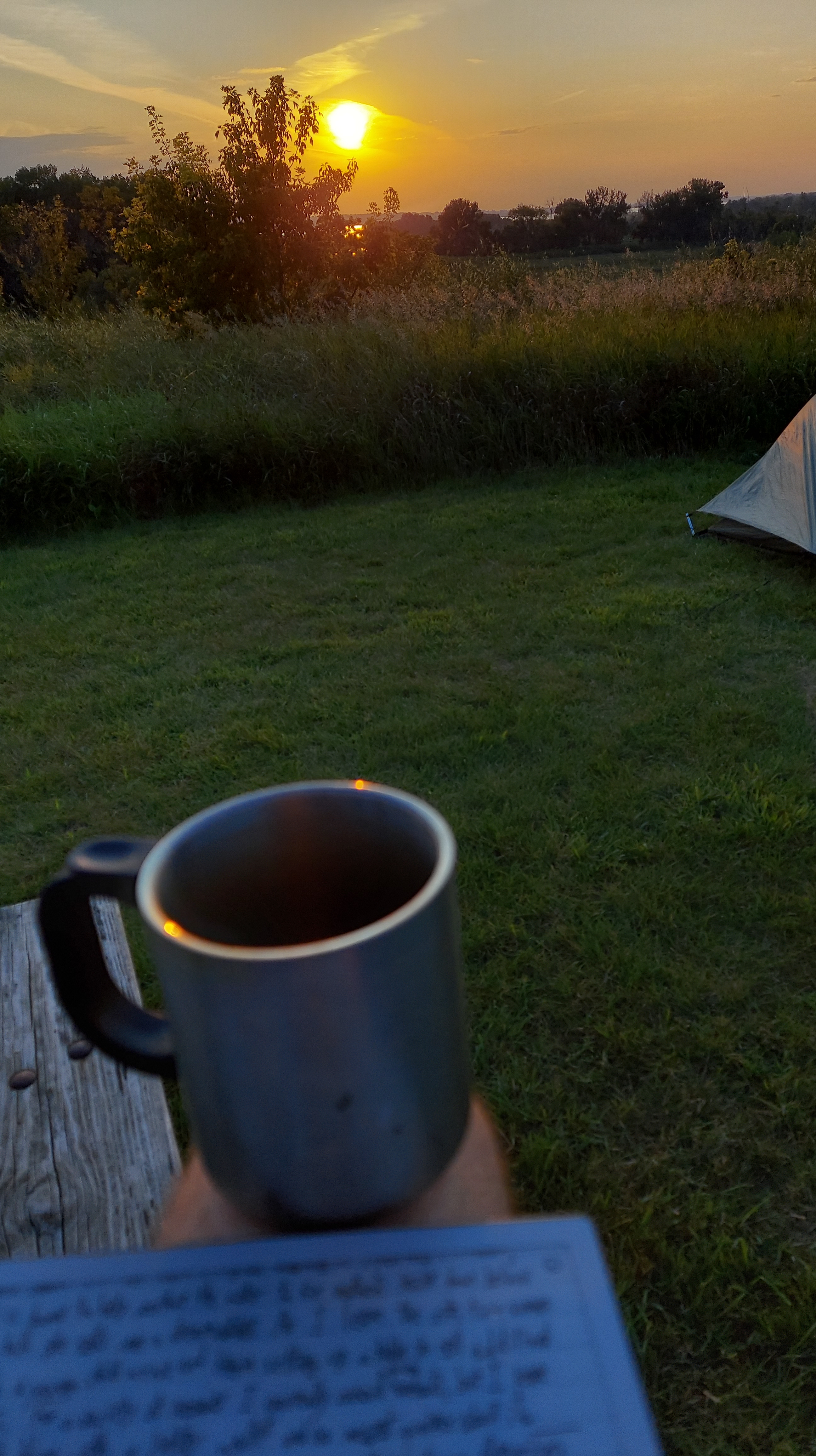 I spend my final night of travel at Lac qui Parle State Park, just across the Minnesota border, in a walk-in campsite amid prairie grasses with a view down to the lake that speaks. It is a perfect evening, and I write easily, the crickets amid the oak savanna pulling me back to some of my deepest-rooted snippets of memory, of warm summer nights outside Madison. (Wisconsin, that is: Madison, Minnesota is the nearest town to Lac qui Parle.) The campground is quiet, mostly empty, but a couple of fires crackle and a warm glow emanates from the camper cabins. A few Pleiades streak overhead. Worries drain away, nagging doubts fall into nothing. I have faith and I have a mission, and a blank space in which to write a name.