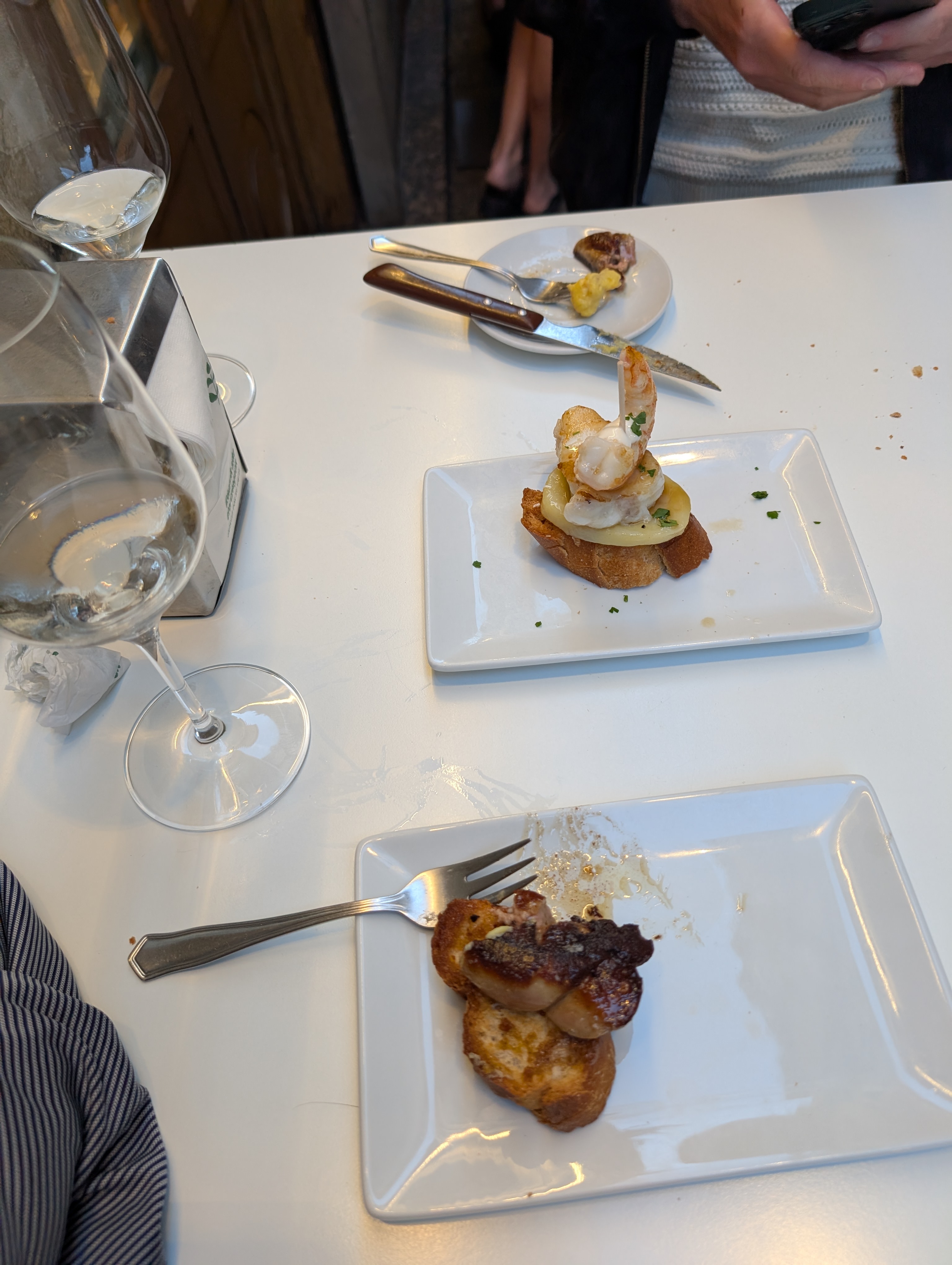 On the first night we do a classic San Sebastián pintxos tour. We start at Ganbara, which Anthony Bourdain called “my favorite place,” and slurp down monkfish, foie, shrimp, crab, and croquetas that melt in the mouth. Despite a massive crowd it is a well-oiled machine, a carefully tended line down the street invited to tables, and there is no rush once seated (or stood, I suppose, as we are at a table on the street). The same cannot be said for several places we try afterward, which are a Lord of the Flies competition for counter space or seats, and in the end we are relieved simply to let a waiter guide us to a table on Konstitizio Plaza, even if the fare is nothing memorable. At some point in the night everyone heeds a silent summons to a place that churns out cheesecake by the boatload, and while it can’t match Casa Rufo it is satisfying, and for a nightcap we sample the local macrobrew, Keler, which is bad.