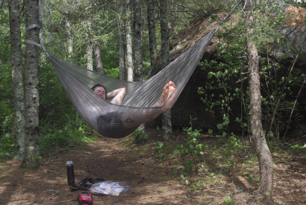 Evan’s eyes roll into the back of his head, but the buzzing mosquitoes distract him from a retort. They’re out for blood, so he picks out a tent pad and sets Mark to staking it out while he fumbles for the cooking gear.