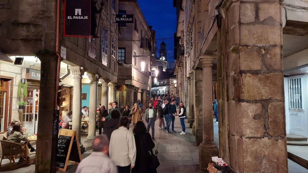 A few blocks away, however, the old city of Pontevedra shows out, and it punches well above its weight. There is a scallop-shell chapel to pilgrims, a prominent convent, a musty old basilica with plants growing all over its façade. On the Camino we see a Spain far removed from the large restoration budgets in Barcelona and Madrid, still grand but worn down by time, the darkness and the odor adding the mystery of a deeper world. The old city’s streets are a maze of small plazas and arcades, ornate charms tucked away on stray corners, clusters of tables waiting to fill.