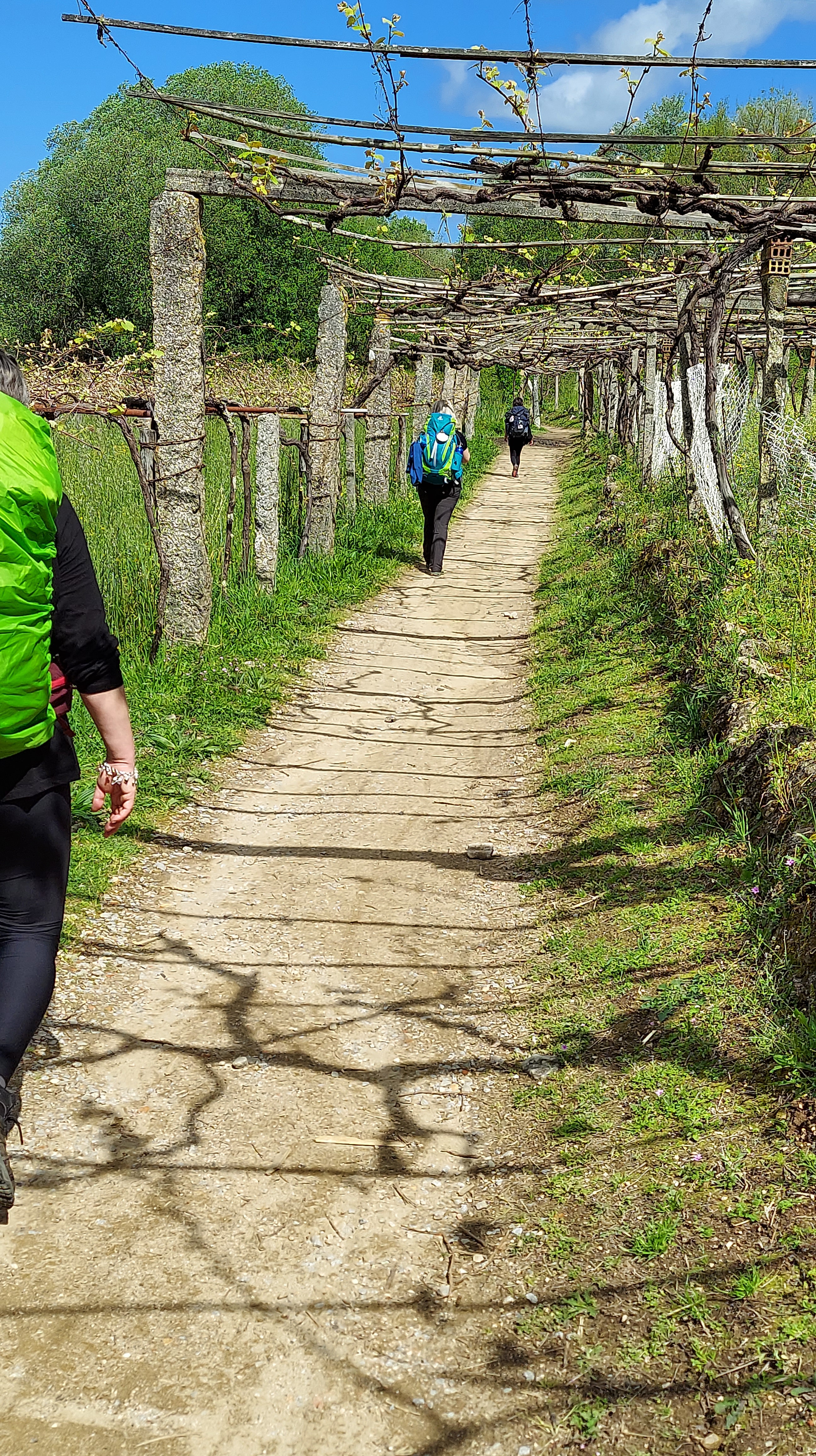 Tired of halfhearted breakfasts, we have scoped out a spot where we had a drink the night before, a bar named Fredyy’s, which delivers a tortilla Española before a plod out of Redondela under moody skies. We climb through its outskirts, snippets of the sea visible here and there, and at the start of a big climb are joined by Roland, a veteran Irish pilgrim shepherding 11 charges along the Camino. He sets a powerful pace up the pavement and talks of the spiritual power of the Camino while lacing in some of the joys of escorting 19-year-olds through bouts of stomach illness. Toward the top we stumble on a collection of North Americans: Ron from Phoenix, who flies a Duluth-made Cirrus plane, and his wife Marnie and a friend; a couple from Houston taking an easy pace; and Julie and Susan from the night before. The trail has grown more crowded, swelled by those who have taken the coastal version of the Camino Portugués and some who have started in Vigo.