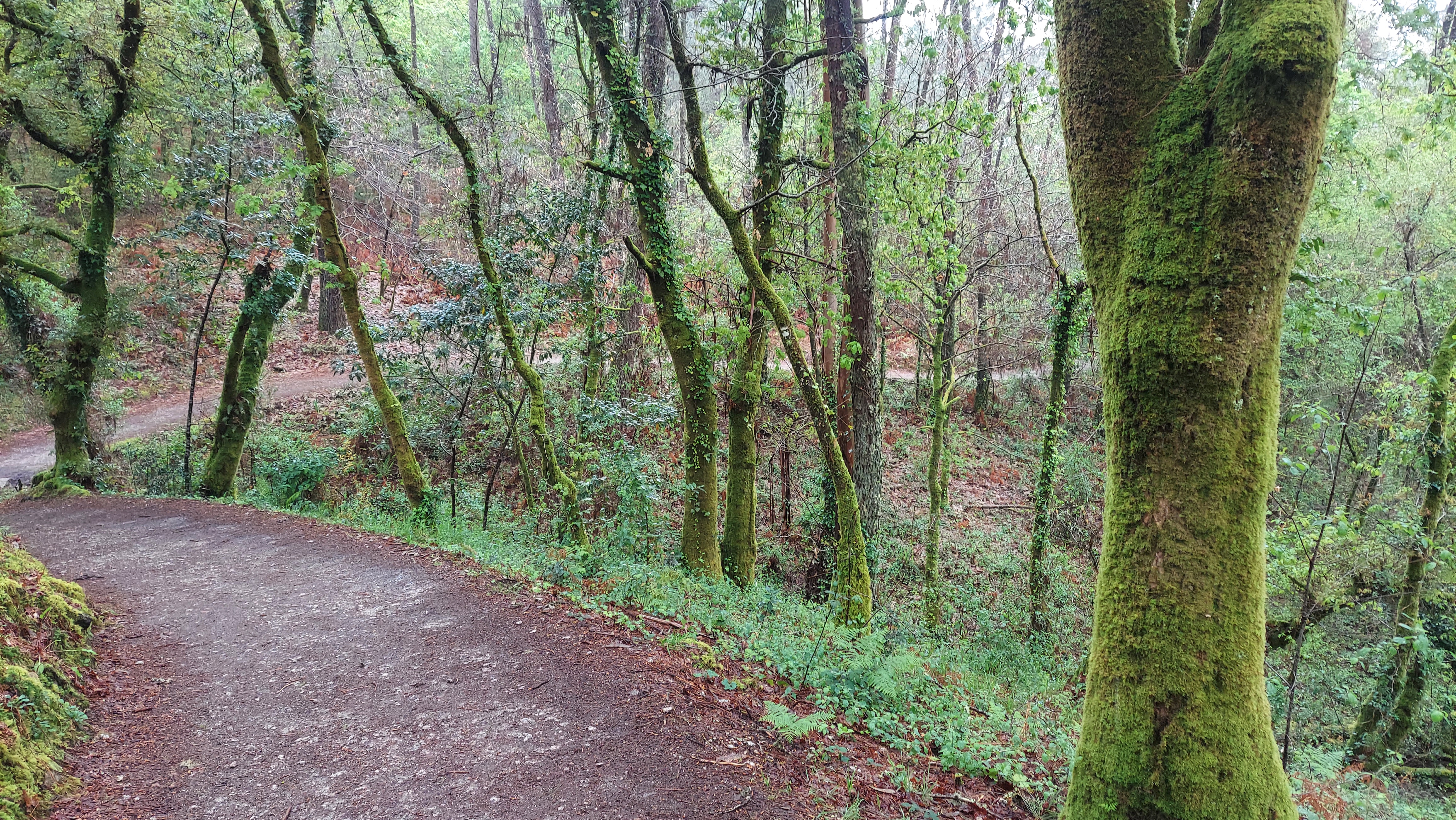 Up on this alto we have views down the Ría, one in a series of inlets cut deep into the Galician coast. It is not quite a fjord—those require glaciers—but evocative of those jagged northern European coasts. The grey skies meet the mood, but the density of the greenery and the clusters of red-roofed homes tell us we’re in a place that is entirely its own. We pause in clearings in the eucalyptus groves to drink in the view.