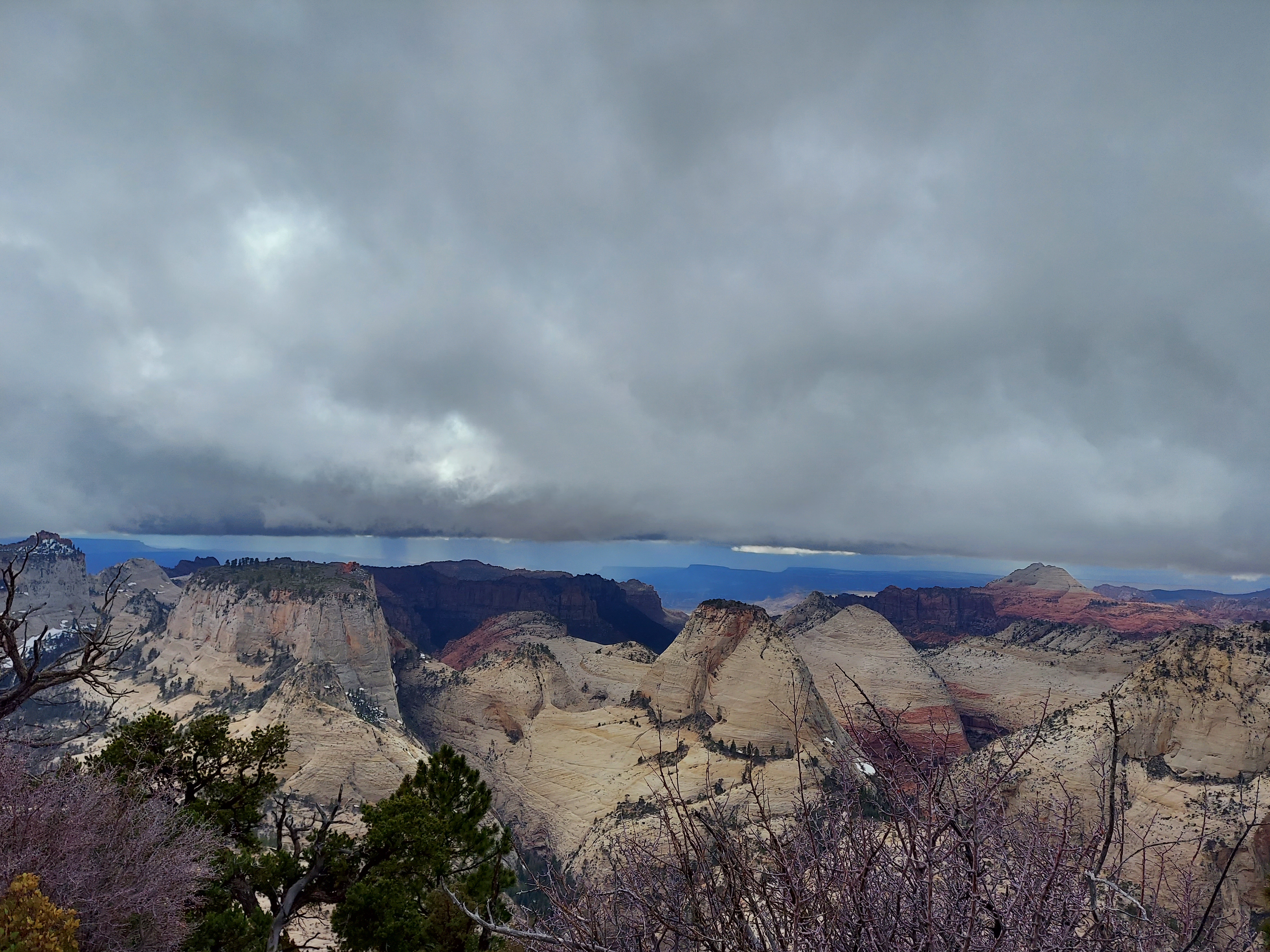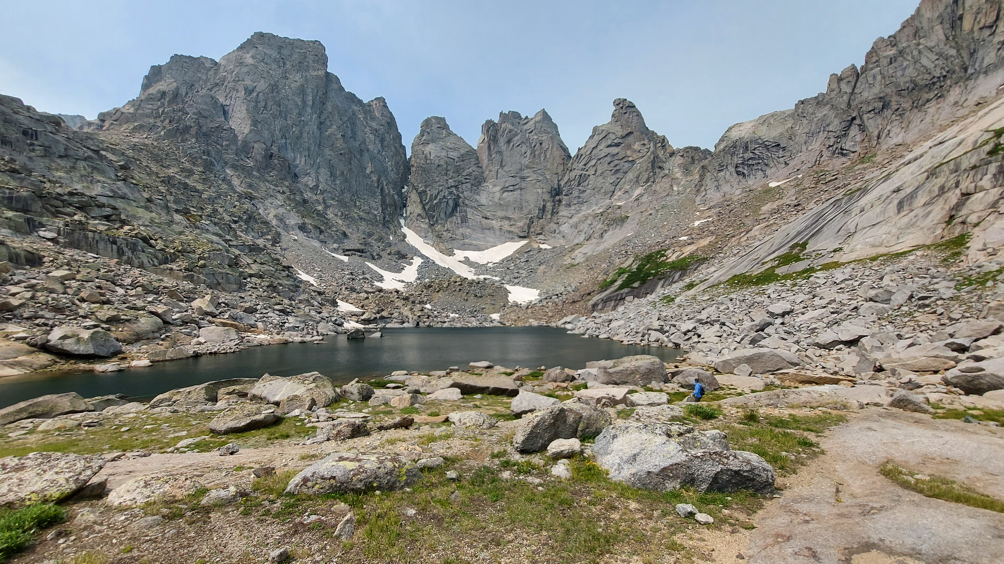On day three, Bob, Rob, and I set out to bag Uncompahgre Peak. We climb along the creek, up through meadows of yellow and purple and white blooms, an open country trek upward as we circle the peak from northwest to southeast, where the main approach lies. Past the looming Matterhorn, up along sudden tan sands and lingering snow, on up the rolling green ramparts beneath the gothic cathedral spires and concave couloirs of Uncompahgre’s south face. A scramble up a harsh grade begets a long, steady ramp up past pikas and yet more flowers and ground set aside for endangered butterflies. Just shy of 14,000 feet, a wall requires some scrambling, but beyond that is a steady, limited-oxygen stroll to the top. From the summit we have a 360 panorama, sun here and storms there, our arrival just in time: distant thunder rumbles, Rob’s hair on his hand perks straight up as he stands astride the peak, and a few snowflakes start to wander down. Every manner of precipitation falls on our now urgent descent: the snowflakes, some sustained graupel, sleet, a little hail, and finally the rain, which picks up in earnest as we approach camp. When we look back up at Uncompahgre, its upper reaches have a light coating of snow. As day hikes go, this is one of the best I’ve ever done, the looming storm only enhancing the conquest of the summit.