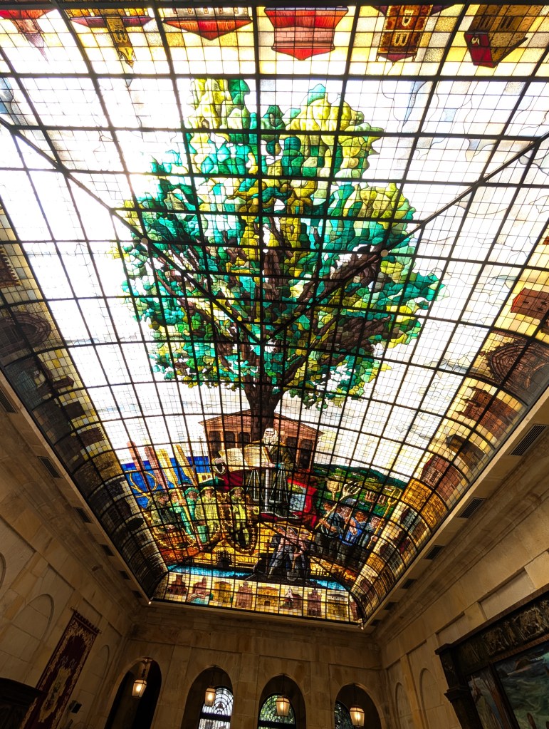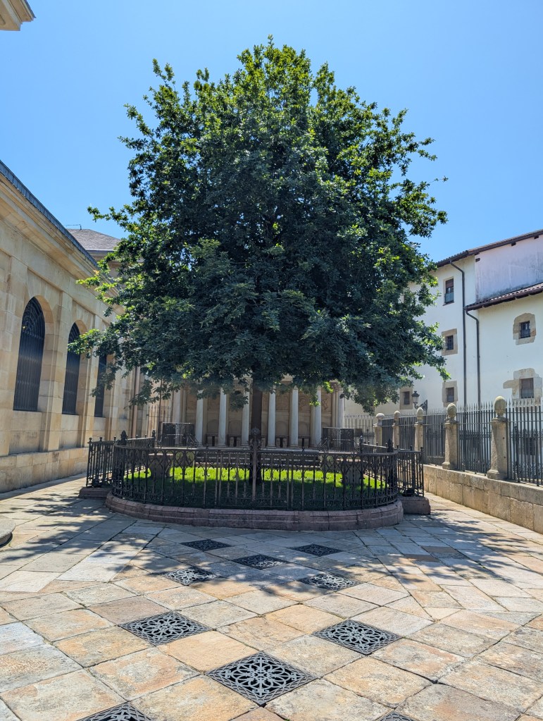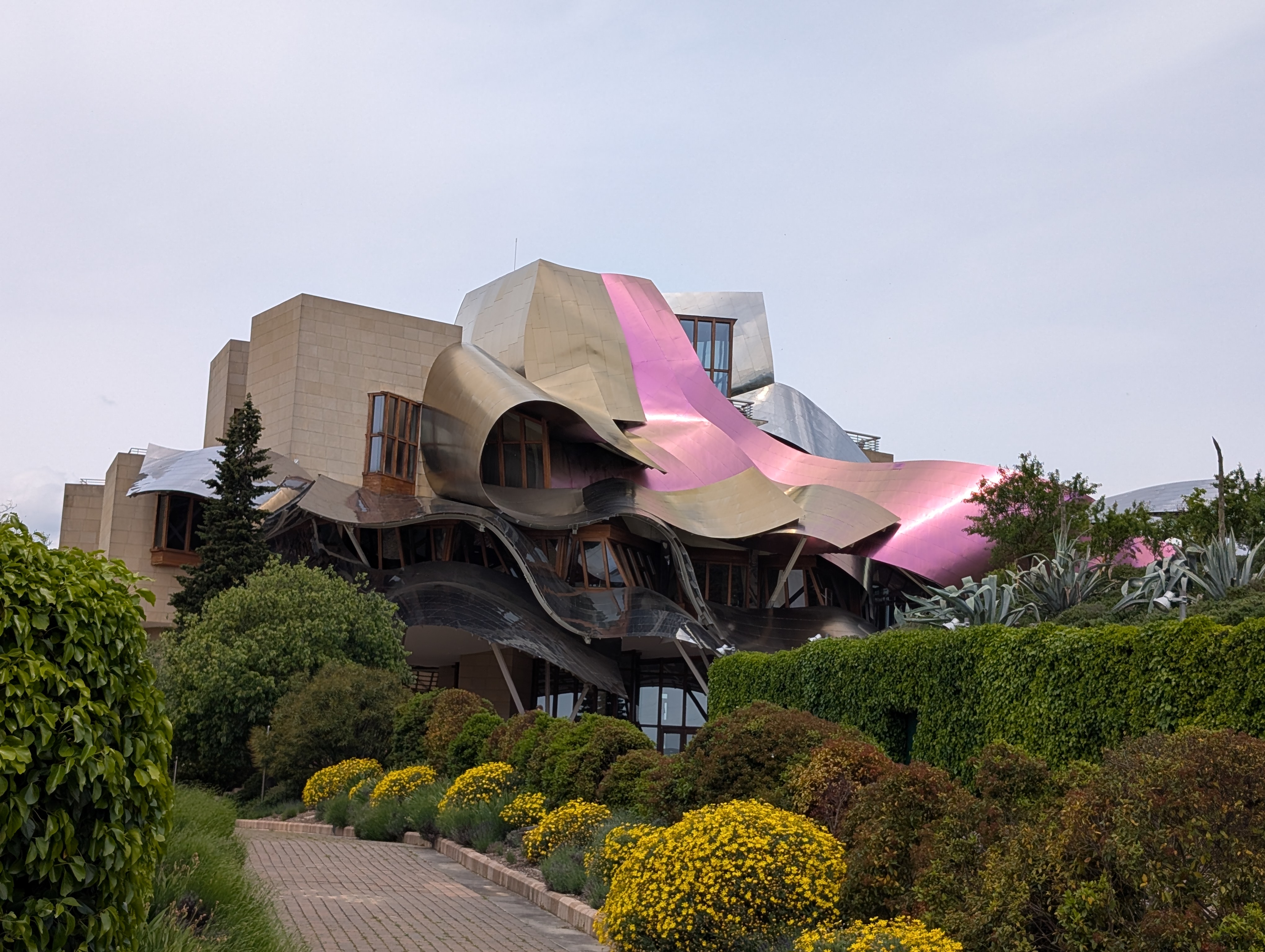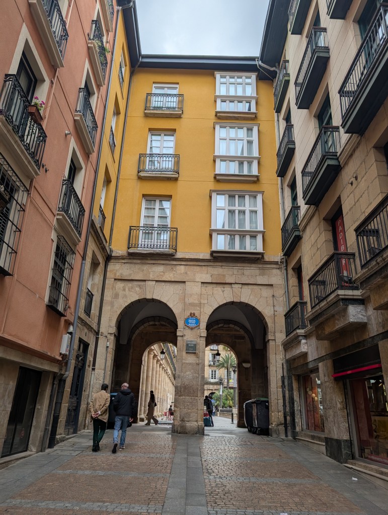 We are of course in Rioja to drink wine. We schedule three tastings, and the two on day one are contrasts in the scale available here. First we visit Miguel Merino, a small producer that we can walk to in Briones, where it’s just us and Lorena, one of the five people employed by this operation founded by an exporter and carried on by his son, relying on small batches and doing some experimentation as they get into many Michelin-starred restaurants. Later, we tour the Marqués de Riscal, an industrial-scale pillar of Rioja complete with a Frank Gehry hotel reminiscent of the Guggenheim, with a dash of wine purple added to the color palette here. The place is massive, a winemaking machine in full force, though the Marquis himself still sits in a corner with some friends sampling the product. Up in Haro, one of the larger towns in the region, we stroll past some of the other big Rioja names in its neighborhood of bodegas and do lunch on a convenient patio at Muga.