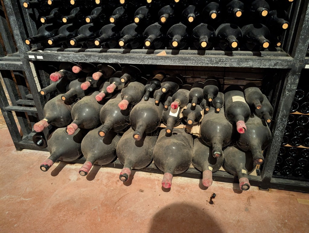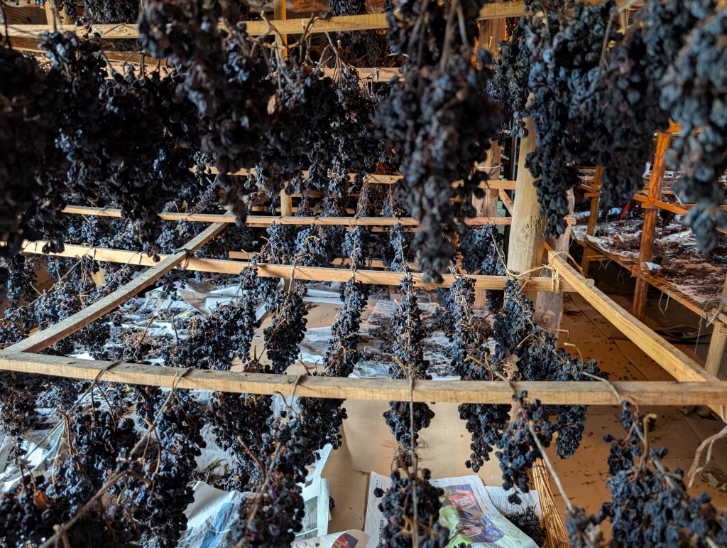Mila takes us in her car up to a vineyard. This is an all-natural, all-organic operation, and all Ojuel bottles feature a different butterfly in honor of these pollinators. The contrast with the neighboring field is striking, these gnarled smaller vines with weeds tangled around their bases separated by a wall of vegetation from the monoculture beyond. (Grapes from the first few rows are sold to other winemakers who don’t care as much about purity, lest any pesticides have drifted in.) This plot’s history is deep, as a stone set here traces its owners back for generations and lists the varietals grown here, though two of the nine are not listed because they have been effectively lost to time. We learn of how Mila’s son Miguel did some oral history work, pulling out old wives’ tales of the supurao wine made for holidays and special celebrations in the youths of some village elders, and reproducing their methods by hanging grapes to dry to produce that rare beast, a delicious sweet wine.
